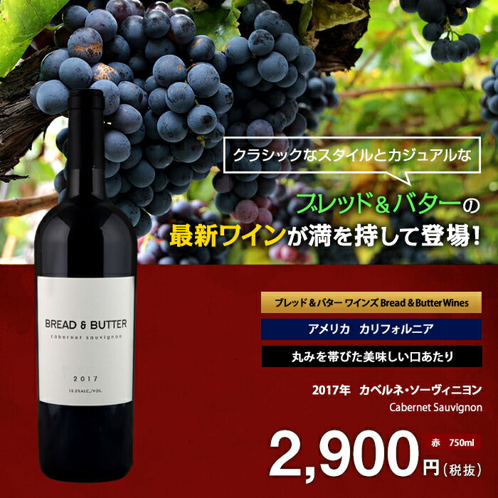 ![ブレッド&バターワインズ[2017]カベルネ・ソーヴィニヨン赤750mlCabernetSauvignon[Bread&ButterWines]アメリカカリフォルニア赤ワイン](http://www.unibis.co.jp/cdn/shop/products/wusca006001_d01_6cf2a255-0df7-44a6-b5bd-a972d5a8fff2_{width}x.jpg?v=1618276547)