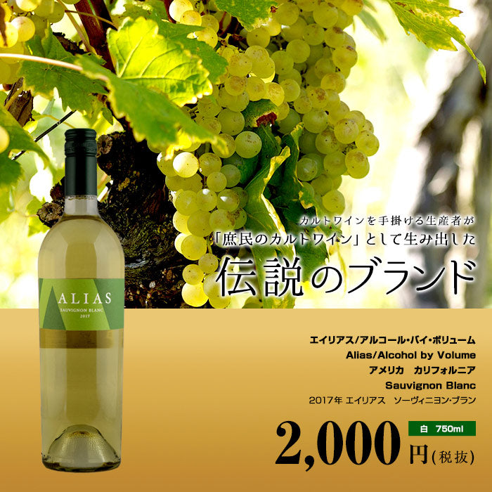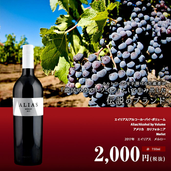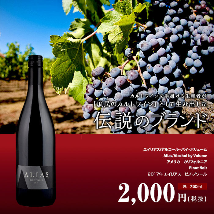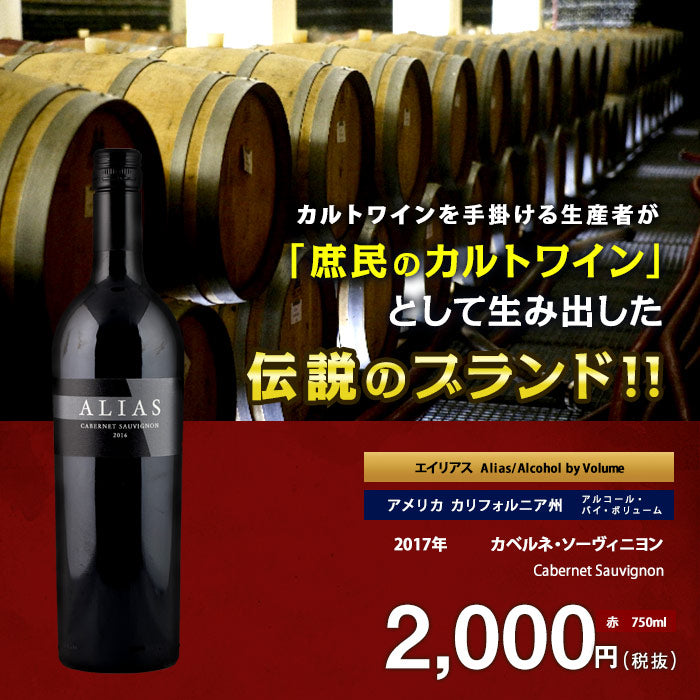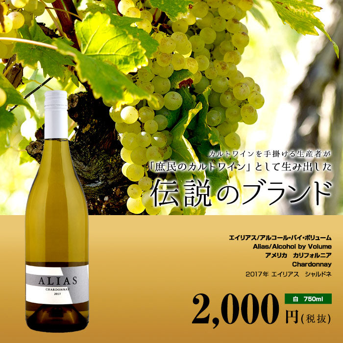 カルトワインを手掛ける生産者が、「庶民のカルトワイン」として生み出した伝説のブランド。ブランド名の"Alias(偽名/匿名)"とあるように、ブドウの供給元、生産者は一切明かされていません。効率的に、リーズナブルに、そして賢く、本当に良いカリフォルニアワインを本当に良い価格で造り出しました。