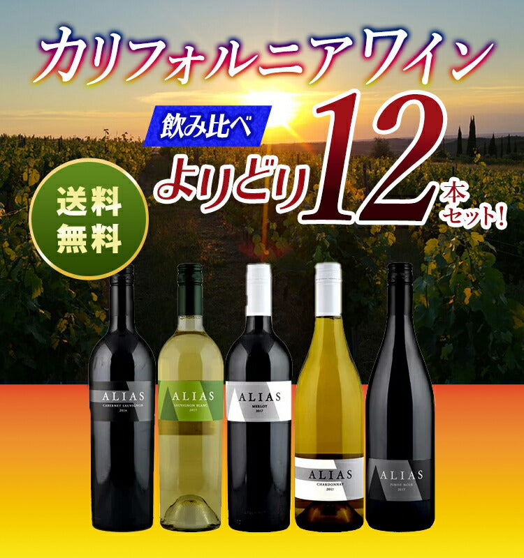 ![【送料無料】カリフォルニアワイン飲み比べよりどり12本セット赤白エイリアス/アルコール・バイ・ボリューム[Alias]カベルネ・ソーヴィニョン/ピノ・ノワール/メルロー/シャルドネ/ソーヴィニョン・ブラン※クール便一部地域は別途送料](http://www.unibis.co.jp/cdn/shop/products/wusca007002_02_541c94ba-73b8-4123-8daa-38c192019f34_{width}x.jpg?v=1618276911)